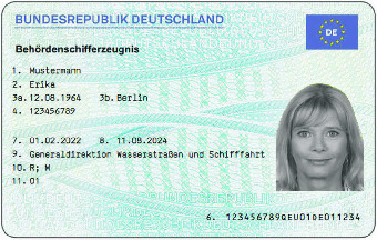 Visuelle Merkmale des Befähigungszeugnisses: Grundfarbe hellblau, nach ISO/IEC 7810