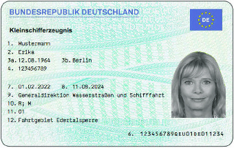 Visuelle Merkmale des Befähigungszeugnisses: Grundfarbe hellblau, nach ISO/IEC 7810
