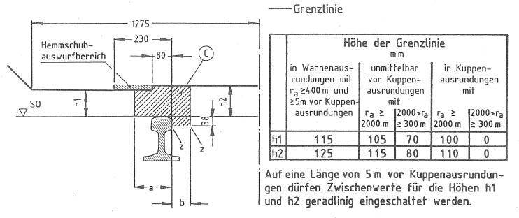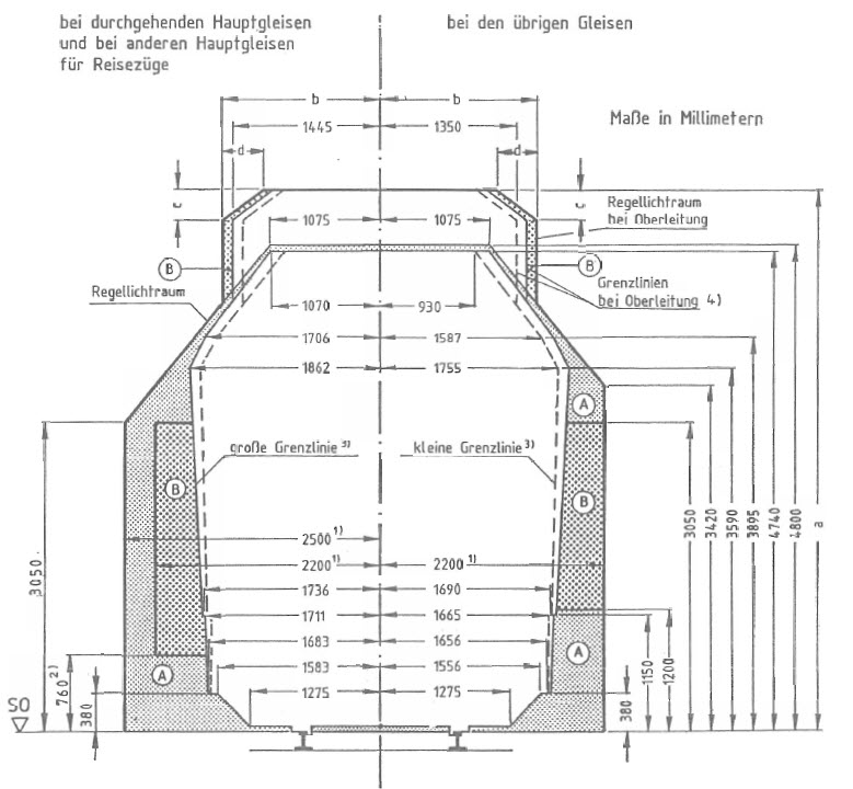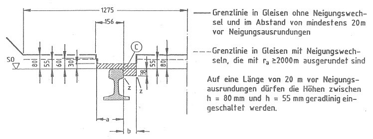 Die Höhenmaße der Grenzlinien beziehen sich auf die Verbindungslinie der Schienenoberkanten (SO) in Istlage (Berücksichtigung der Schienenabnutzung).