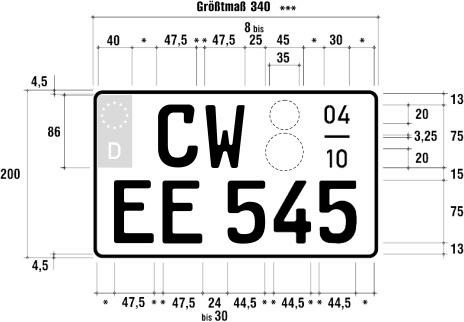 - zweizeilige Kennzeichen: Größtmaß der Breite: 340 mm, bei zwei- und dreirädrigen Kraftfahrzeugen 280 mm, Höhe: 200 mm
