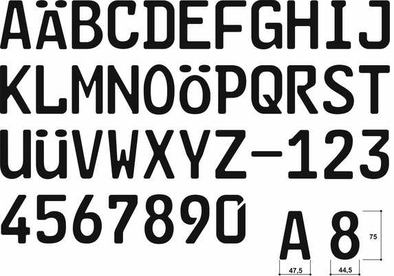 - Soweit sich aus dieser Verordnung nichts anderes ergibt, erfolgt die Beschriftung nach dem anliegenden Schriftmuster der Normvorschrift DIN 1451-2:1986-02 (Verkehrsschrift) (nach dem Hilfsnetz hergestellt), und zwar grundsätzlich für Buchstaben und Zahlen in Mittelschrift. Reicht die vorgesehene Höchstlänge des Kennzeichens hierfür nicht aus oder lässt die etwa vorgeschriebene oder die vom Hersteller vorgesehene Anbringungsstelle für Kennzeichen dies nicht zu, so darf fette Engschrift verwendet werden. Bei Umlauten darf die vorgesehene Schrifthöhe nicht überschritten werden. Der waagerechte Abstand der Beschriftung einschließlich Plaketten zum schwarzen, blauen oder grünen Rand muss auf beiden Seiten gleich sein.