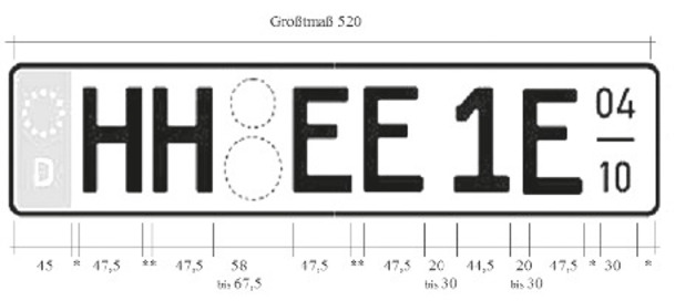 - einzeilige Kennzeichen: Größtmaß der Breite: 520 mm, Höhe: 110 mm