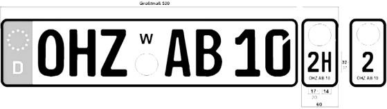 - vier Stellen in der Erkennungsnummer (Buchstaben und Ziffern – ohne Kennbuchstaben „H“) auf einem Kennzeichen nach Nummer 2 mit einem Größtmaß von 280 mm oder einem Kennzeichen nach Nummer 2a