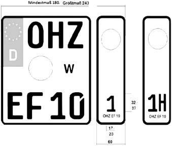 - Kraftradkennzeichen: Mindest-/Größtmaß der Breite: 180 mm/220 mm, Höhe: 200 mm