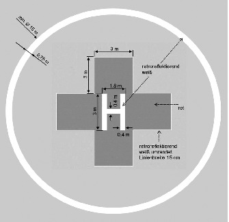 Die äußere Begrenzung der Start- und Landefläche ist mit einer 0,75 Meter breiten Randmarkierung zu versehen.