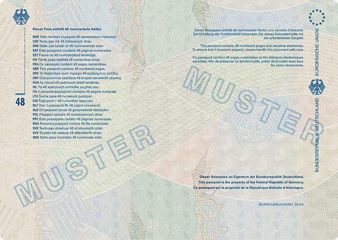 | Reisepass (48 Seiten) | Buchseite 48 und Vorsatz des hinteren Einbandes |