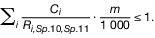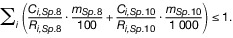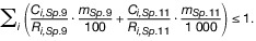 - Sollen in einem Kalenderjahr sowohl Massen mit Radionukliden unter der Maßgabe der Anlage 4 Tabelle 1 Spalte 8 als auch der Anlage 4 Tabelle 1 Spalte 10 zur Beseitigung auf einer Deponie freigegeben werden, so ist abweichend von Teil A Nummer 1 Buchstabe e Satz 1 bei mehreren Radionukliden die Summe der Produkte der Verhältniszahlen Ci/Ri aus der freizugebenden spezifischen Aktivität (Ci) und den jeweiligen Freigabewerten (Ri) der einzelnen Radionuklide i nach Anlage 4 Tabelle 1 Spalte 8, multipliziert mit einem Hundertstel der freizugebenden Masse und dem Produkt der Verhältniszahlen Ci/Ri aus der freizugebenden spezifischen Aktivität (Ci) und den jeweiligen Freigabewerten (Ri) der einzelnen Radionuklide nach Anlage 4 Tabelle 1 Spalte 10, multipliziert mit einem Tausendstel der freizugebenden Masse, zu berechnen. Diese Summe darf den Wert 1 nicht überschreiten: